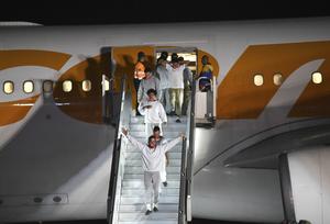 (250220) -- LA GUAIRA, 20 febrero, 2024 (Xinhua) -- Ciudadanos venezolanos deportados de Estados Unidos festejan mientras descienden de un...