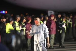 (250220) -- LA GUAIRA, 20 febrero, 2025 (Xinhua) -- Un ciudadano venezolano deportado de Estados Unidos reacciona a su llegada...