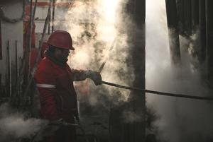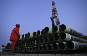 (250220) -- AKSU, 20 febrero, 2025 (Xinhua) -- Un trabajador revisa las tuberías de revestimiento en el sitio de perforación...