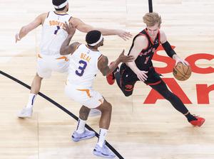 (250224) -- TORONTO, 24 febrero, 2025 (Xinhua) -- Imagen del 23 de febrero de 2025 de Gradey Dick (d), de...