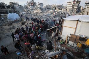 (250304) -- GAZA, 4 marzo, 2025 (Xinhua) -- Personas esperan para recibir ayuda alimentaria durante el Ramadán, en la Ciudad...