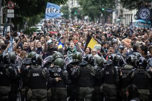 (250312) -- BUENOS AIRES, 12 marzo, 2025 (Xinhua) -- Un elemento de la Gendarmería Nacional apunta a manifestantes que participan...